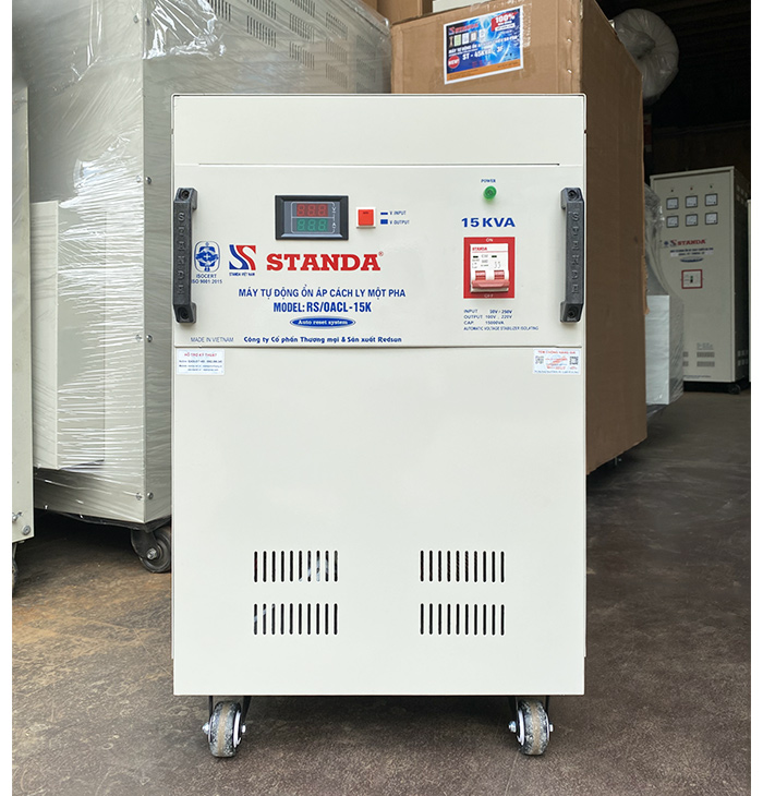 Ổn áp cách ly Standa 15KVA điện áp 90V~250V điện ra 100V; 220V là dòng ổn áp được dùng cho gia đình với công dụng là đổi nguồn, cách ly chống giật, chống nhiễu, phòng chống cháy nổ do chập điện quá tải, an toàn hơn khi sử dụng bình nóng lạnh, ổn định điện áp, kéo điên khỏe chạy êm bên bỉ.